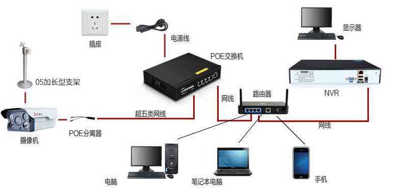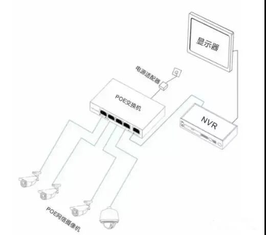 这是一种比较常用的方法,很多朋友都在使用,在综合布线的时候,同时要布电源线和网线,电源也可以就近取220V交流电,这样节省电源线材,这里暂不讨论它的利弊。给每个网络摄像机提供电源。再有一路网线传输网络数据到网络硬盘录像机NVR。